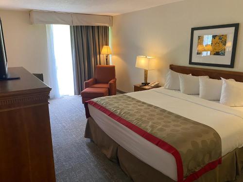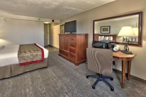 Ramada by Wyndham Albuquerque Midtown酒店的每间客房均拥有深色木制家具,配有白色豪华床单、免费WiFi、平板电视、独立浴室、休息区和免费洗浴用品。
