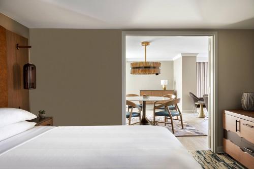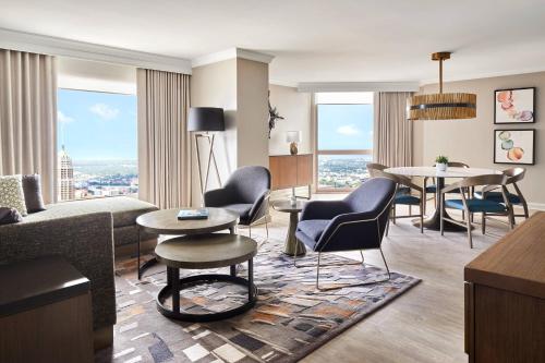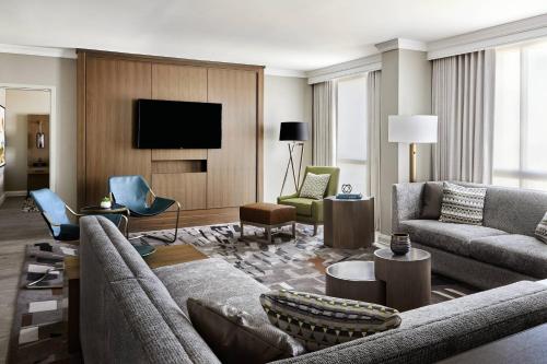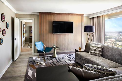 The rooms at San Antonio Marriott Rivercenter on the River Walk include a flat screen TV, a coffee maker, a work desk and a seating area.