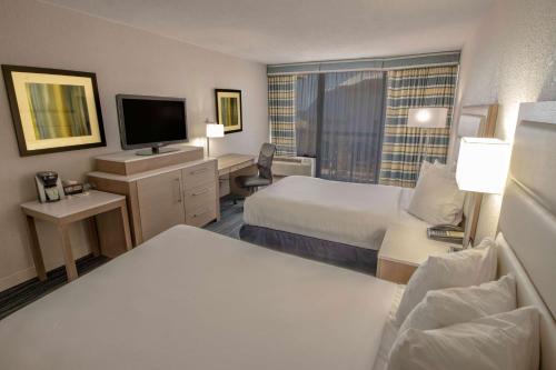 Each guest room at the Wyndham Virginia Beach Oceanfront includes a balcony, flat-screen TV and refrigerator.