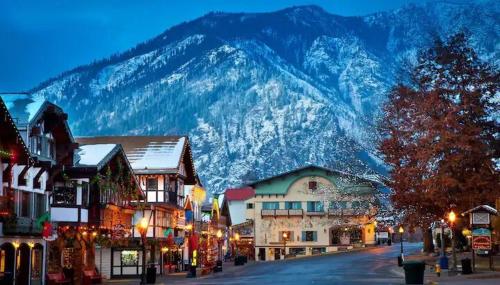 Luxe Bavarian Retreat - in Town with Hot Tub位于莱文沃思,提供带免费WiFi的山景客房,配有花园、酒吧和滑雪至门口雪道。这家公寓配备免费私人停车位。客人可以在周边地区体验滑雪和骑行等活动。