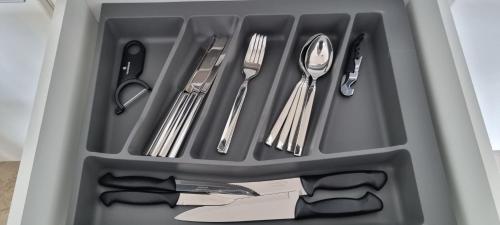 这家空调公寓配有1间卧室、起居室、带冰箱和电热水壶的设施齐全的厨房以及1间带淋浴设施和免费洗浴用品的浴室。1间浴室配有浴缸,也为客人提供吹风机,提供毛巾和床上用品。