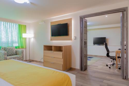 La Joya Pachuca酒店的空调客房铺有地毯,拥有现代装饰。每间客房均配有平板有线电视、免费WiFi和咖啡设施。私人浴室配有吹风机。