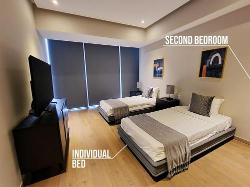 这家公寓配有2间卧室、带冰箱和烤箱的厨房以及2间带热水浴池、吹风机和洗衣机的浴室。这家公寓也拥有休息区和2间浴室。
