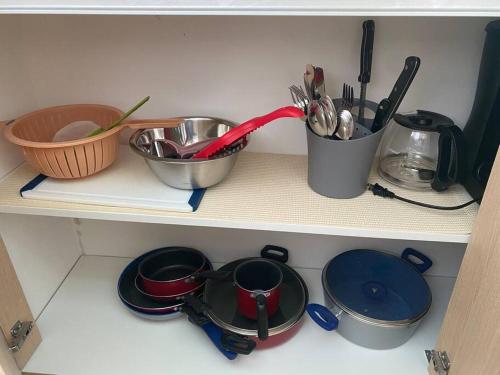 这家空调公寓配有1间卧室、起居室、带冰箱和咖啡机的设施齐全的厨房以及1间带淋浴设施和吹风机的浴室。这家公寓也配有1间浴室。