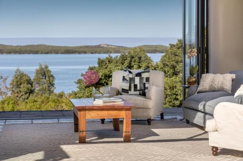 这家度假屋提供庭院,享有海景,配有4间卧室、起居室、平板电视、带冰箱和洗碗机的设施齐全的厨房以及4间带淋浴设施的浴室。4间浴室配有浴缸,也为客人提供吹风机,提供毛巾和床上用品。