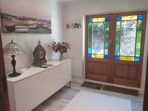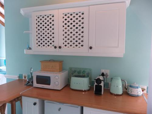 Adjoining the lounge is a beautiful and well appointed double suite, with a panoramic sea view, large sea facing balcony with table and chairs. The suite has one bedroom with a queen-size bed, an en-suite bathroom with separate free standing bath, shower, and an antique oak wash stand, air-conditioning and fan and a mini kitchen with self-catering facilities. The TV has streaming access to You Tube and some international news channels.