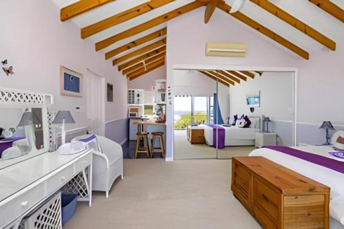 Comprising the whole of the upper floor of this charming cottage and 150 square meters in size, in a quiet and peaceful area, this luxury self catering sea facing Penthouse Apartment has its own private entrance, a large lounge furnished in beach house style with 6 metre wide patio doors which lead out onto an enormous balcony with breathtaking views of the Atlantic Ocean and the Twelve Apostle mountains. A dining area is in the lounge with a table & chairs.