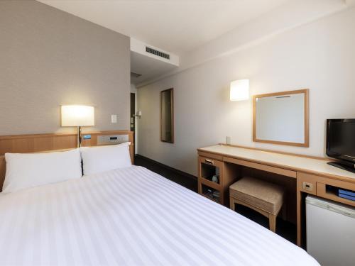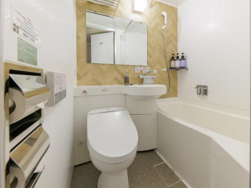 Tenjin Nishitetsu Inn酒店的每间紧凑型客房均铺有地毯,并配有书桌。连接浴室内配有拖鞋、淋浴、浴缸和冰箱。