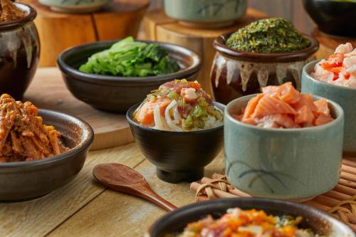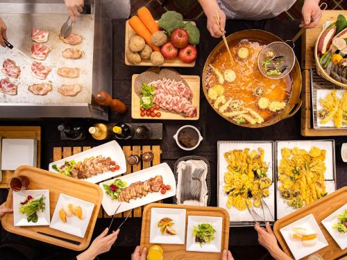 Tea Lounge Lyrical茶室空间宽敞,提供高大的窗户,供应茶和热饮。自助晚餐提供60多种菜肴,包括寿司、铁板烧、天妇罗和甜品。