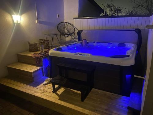 这家1卧室度假屋配有起居室、平板电视、带冰箱和烤箱的设施齐全的厨房以及1间带热水浴池的浴室。1间浴室配有浴缸,也拥有吹风机,提供毛巾和床上用品。