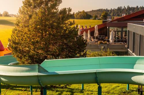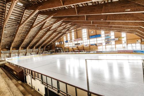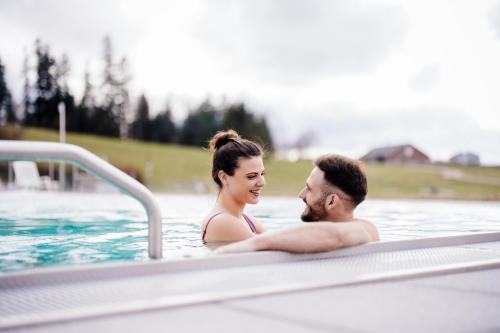The Jura Sport & Spa Resort's outdoor swimming pool is bathed in coloured lights and is kept at a temperature of 34 degrees. There is also an ice skating rink at the property. Both can be used against a surcharge.