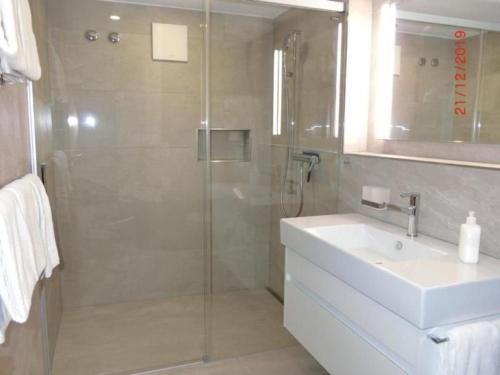 Chalet Raufthubel, 1 Stock配有带有线频道的电视、带冰箱和洗碗机的设施齐全的小厨房以及带淋浴设施和吹风机的浴室。