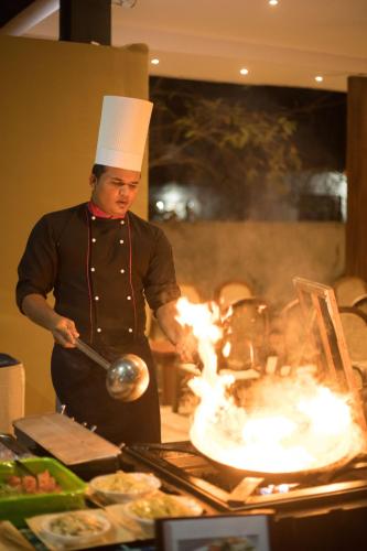 客人可以在酒店内餐厅的室外顶棚下用餐。餐厅供应斯里兰卡本地、印度、中国和欧洲美食。