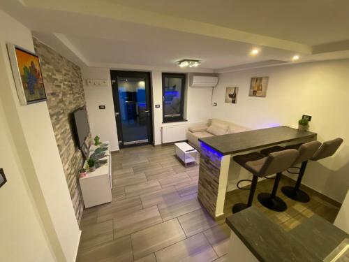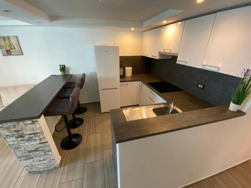 这家空调公寓配有2间卧室、起居室、带冰箱和电热水壶的设施齐全的厨房以及1间带淋浴设施和吹风机的浴室。这家公寓也配有休息区和1间浴室。
