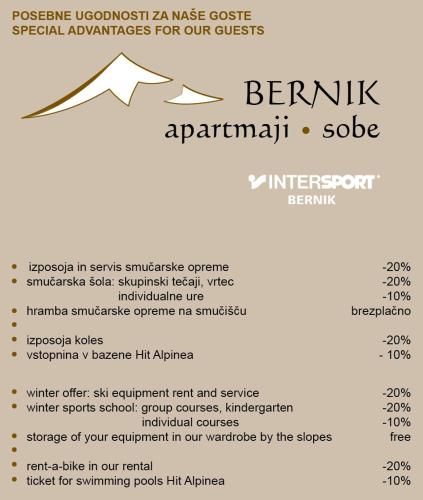 Apartment Bernik II提供滑雪设备租赁服务和自行车租赁服务。客人可以在附近体验滑雪和骑行。
