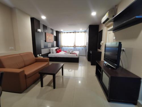 Suvarnabhumi Regent酒店的宽敞公寓配有深色木制家具和32英寸平板电视,提供1个休息区、小厨房和充足的工作空间。