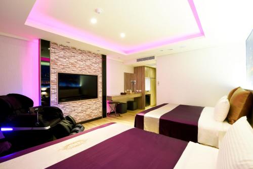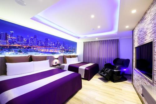 新竹-紫晶彩绘汽车旅馆距离新竹火车站有6分钟的步行路程,提供带免费WiFi的客房和私人停车场。