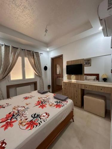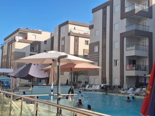 Penthouse Overlooking Pool in South Hammamet Beach Resort坐落于Nabeul Governorate的Hammamet Sud,配有阳台,享有池景。这家自助式公寓拥有私人泳池、花园、烧烤设施、免费WiFi和免费私人停车位。
