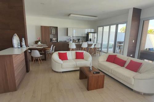 这家空调度假屋配有2间独立卧室、带冰箱和微波炉的设施齐全的厨房以及5间浴室。这家度假屋还提供平板电视以及5间带热水浴池的浴室。