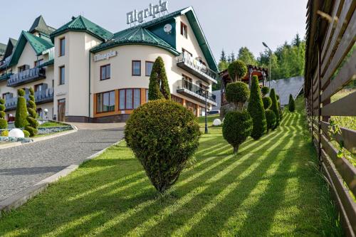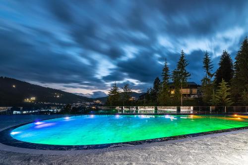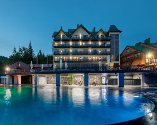 Hotel Podgorie度假村距离Bukovel Ski Resort滑雪场的滑雪缆车800米,设有免费雪具寄存处、免费WiFi、桑拿浴室和spa中心。