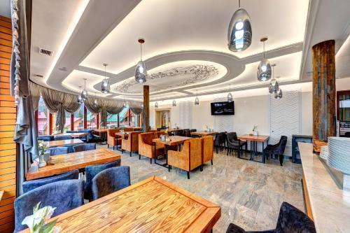 Podgorie度假村的餐厅设有俯瞰群山的全景窗户,供应乌克兰菜肴。度假村内还设有意大利比萨餐厅。