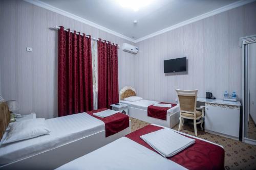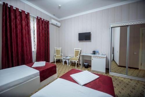 房间均配有空调、带卫星频道的平板电视、迷你吧、电热水壶、淋浴设施、免费洗浴用品和书桌。客房提供配备浴缸和吹风机的私人浴室。这家酒店的部分房间也配备庭院。Reikartz Modarixon Bukhara的所有客房都拥有床上用品和毛巾。