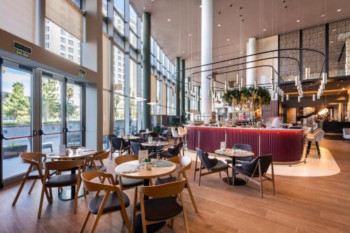 The hotel's Socarrat restaurant specializes in Valencian paellas, as well as Mediterranean and international cuisine. The Oval Bar has a small snack and drink menu for every hour of the day.