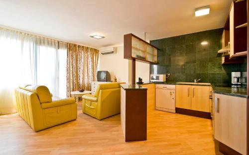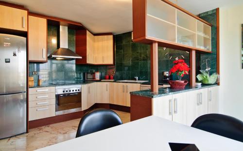 房间提供享有市景和山景的露台或阳台,配有空调、休息区、有线频道平板电视和厨房。住宿还配备冰箱、洗碗机和烤箱以及咖啡机和电热水壶。
