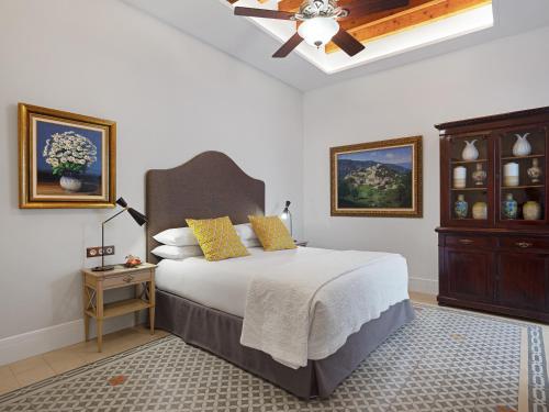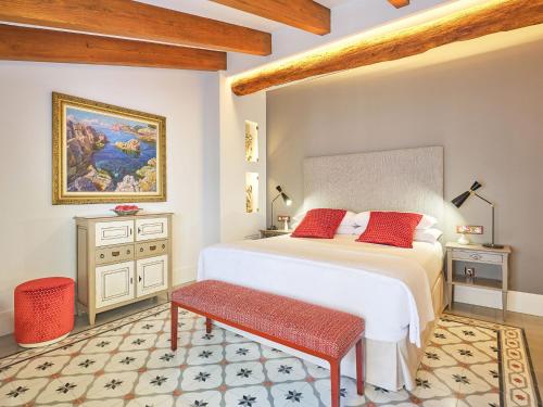 Hotel Gloria de Sant Jaume酒店坐落在一座经过修复的19世纪建筑内,拥有传统元素,如外露式木梁、液压瓷砖和大理石浴室。
