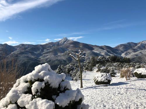 这家度假屋提供庭院,享有山景,拥有2间卧室、起居室、平板电视、带冰箱和烤箱的设施齐全的厨房以及1间带浴缸的浴室。1间浴室提供吹风机。