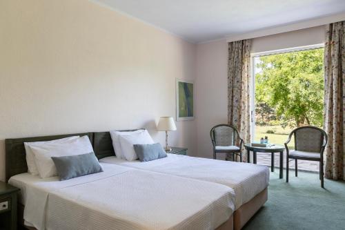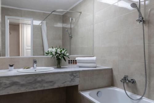 Amalia Hotel Kalambaka酒店提供奥林匹克规格游泳池和被葱郁的花园所环绕的带家具的阳光露台。酒店的公共区使用传统材料建成,配有横梁天花板、带壁炉的酒廊酒吧、钢琴酒吧和2间餐厅。