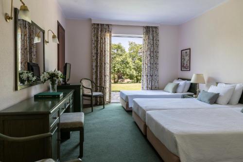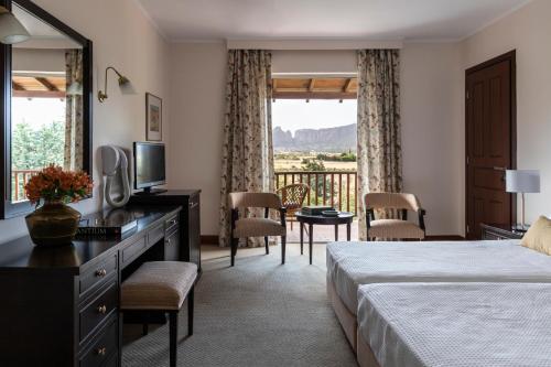 Amalia Hotel Kalampaka酒店的宽敞客房配有空调、卫星电视和迷你冰箱,拥有典雅的装饰,提供深色木制家具和柔和的色彩,还配有带吹风机和免费洗浴用品的浴室。酒店可应要求提供熨烫设施。