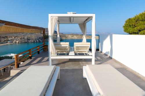 客人可以在热水浴池旁边的日光浴躺椅上放松身心,欣赏一览无余的海景,还可以在户外用餐区享受户外用餐的乐趣。