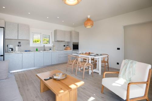这家别墅配有2间卧室、2间浴室、床上用品、毛巾、带卫星频道的电视、用餐区、设施齐全的厨房以及海景露台。这家空调别墅还配备休息区、洗衣机以及2间带淋浴设施的浴室。