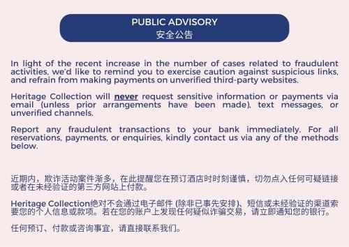 Strategically located within the Central Business District,Heritage Collection on Seah - Mobile App Check-In offers modern accommodation with free WiFi throughout the property. It is conveniently within a 5-minute walk to Cityhall, Bugis and Esplanade MRT Stations.