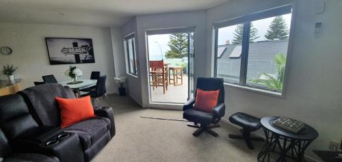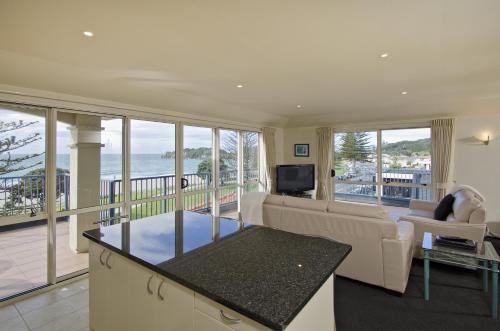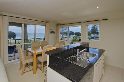 Pavilion Beachfront Apartments公寓距离天然海水温泉池和城市班车站有不到2分钟的步行路程。隔壁拥有几家咖啡馆。公寓距离陶朗加机场(Tauranga Airport)有10分钟车程。