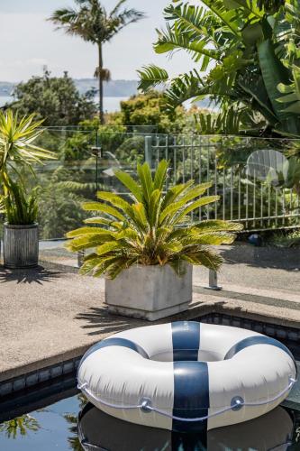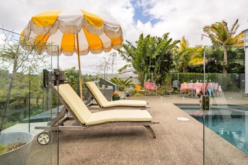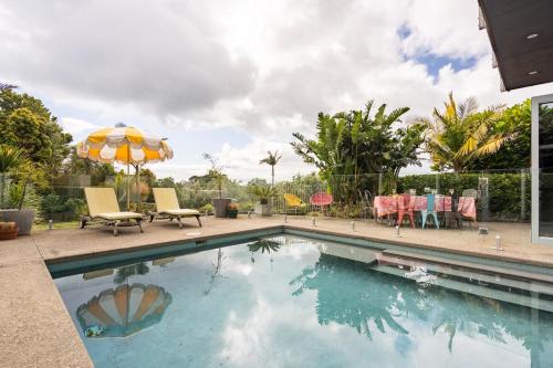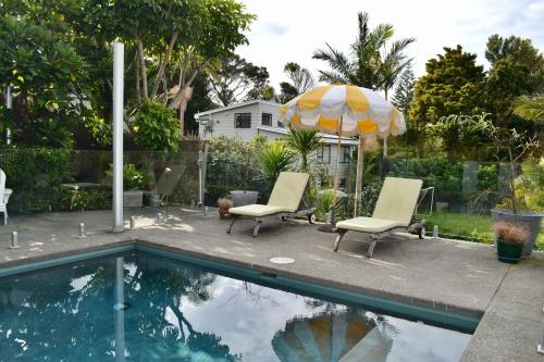 Stanmore Bay lush garden with pool, close to beach享有池景,提供户外游泳池和庭院,距离奥克兰海港大桥约有33公里。这家自助式公寓配有私人泳池、花园和免费私人停车位。