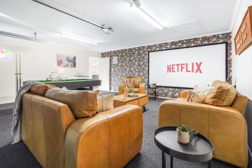 Cinema, Pool-Table, Dart Board, -By KOSH BNB坐落于汉密尔顿,提供花园和露台,距离怀卡托体育场有8.8公里,距离汉密尔顿花园有10公里,距离神秘河活动中心有22公里。这家住宿的客人可以使用阳台、桌球台、免费私人停车位和免费WiFi。