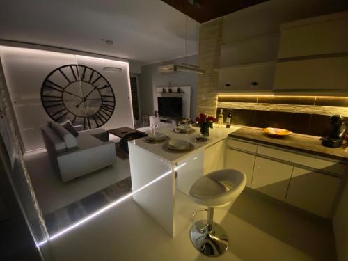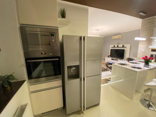 这家空调公寓配有1间卧室、起居室、带冰箱和电热水壶的设施齐全的厨房以及1间带浴缸和吹风机的浴室。这家公寓也配备1间浴室。