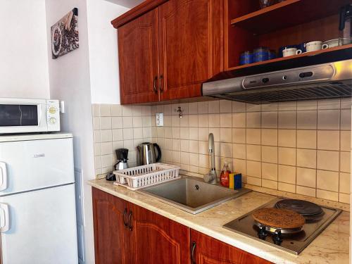 这家空调公寓配有1间卧室、起居室、带冰箱和咖啡机的设施齐全的小厨房以及1间带浴缸或淋浴设施和吹风机的浴室。这家公寓也配备1间浴室。