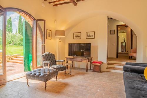 这家别墅提供烧烤设施。Podere Bargnano Cetona, Sleeps 12, Pool, WiFi, Air conditioning配备露台和共用休息室。