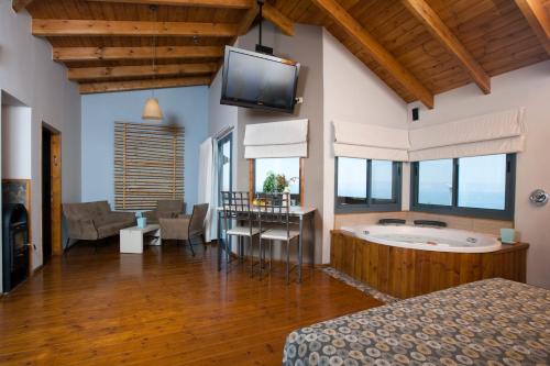 Ramot Resort Hotel 酒店位于Golan 高地的山脚下,可一览加利利海的美景,提供设备完善的客房和绿色草坪环绕的小屋。