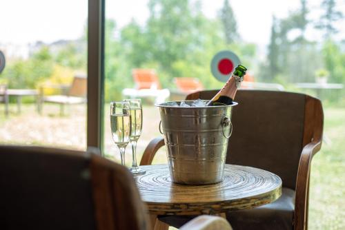 宁静的客房装饰优雅。部分客房俯瞰森林。部分客房位于底层,设有私人露台和室内热水浴池。
