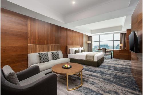 The hotel features a fitness center with a pool view and in-room massage services. Free WiFi is accessible throughout the hotel. Aryaduta Medan offers spacious air-conditioned rooms with a contemporary yet classy carpeted design. Each room is equipped with a flat-screen TV, a safe, seating area, and tea/coffee-making facilities. The bathrooms come with showers and complimentary toiletries. Some room types offer a larger seating area with a sofa.