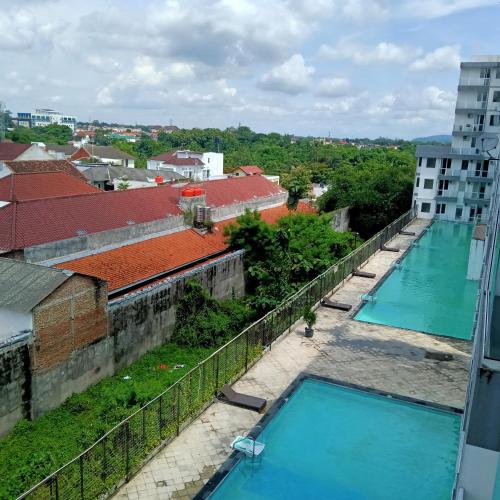 Vin's Room at Vivo Apartemen位于Seturan,配备花园和私人泳池,享有山景。这家住宿享有池景,配备阳台。