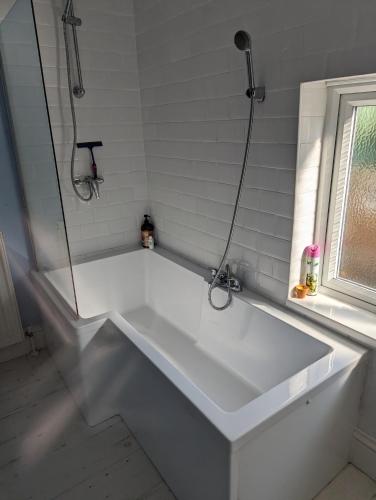 这家度假屋提供露台,享有花园景,配有1间卧室、起居室、平板电视、带冰箱和洗碗机的设施齐全的厨房以及1间带淋浴设施的浴室。1间浴室配有浴缸,也拥有免费洗浴用品,提供毛巾和床上用品。