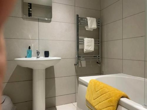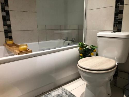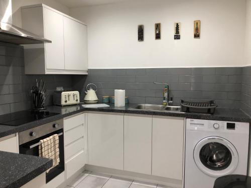 这家公寓配有1间卧室、起居室、带冰箱和电热水壶的设施齐全的厨房以及1间带淋浴设施和吹风机的浴室。这家公寓还配备平板电视、休息区、洗衣机以及1间带浴缸的浴室。