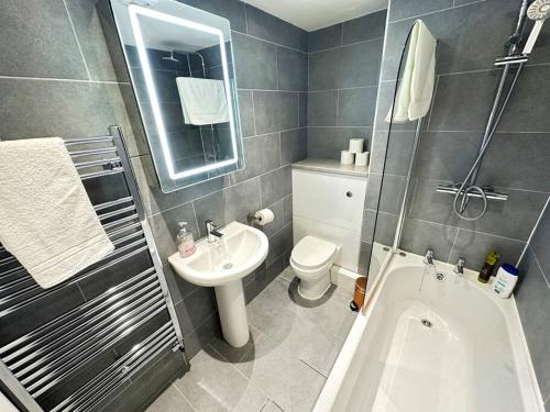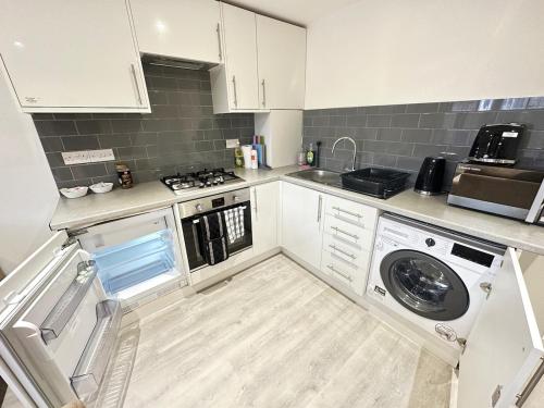 这家公寓配有1间卧室、起居室、带冰箱和电热水壶的设施齐全的厨房以及1间带淋浴设施和吹风机的浴室。这家公寓还提供平板电视、洗衣机以及1间带浴缸的浴室。