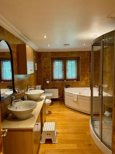 这家度假屋提供露台,享有花园景,配有5间卧室、起居室、平板电视、带冰箱和洗碗机的设施齐全的厨房以及5间带淋浴设施的浴室。5间浴室配有热水浴池,也为客人提供免费洗浴用品,提供毛巾和床上用品。
