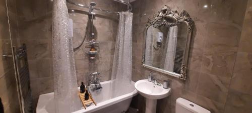 这家度假屋享有花园景,提供庭院,配有3间卧室、起居室、卫星频道平板电视、设施齐全的厨房以及1间带淋浴设施和浴缸的浴室。这家度假屋也提供休息区和1间浴室。